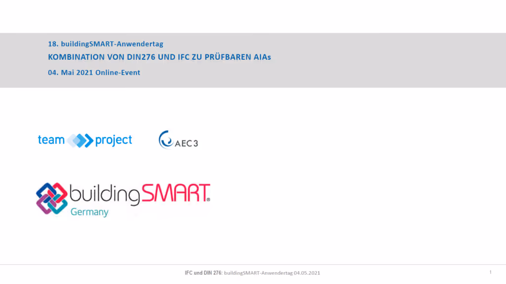 Im Rahmen des 18. buildingSMART-Anwendertags am 04.05.2021 beteiligte sich teamproject gemeinsam mit Herrn Weise von AEC3 mit einem Vortrag zur Kombination von DIN 276 und IFC zu prüfbaren AIAs am ganztägigen Online-Event.