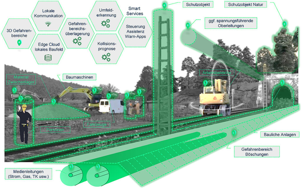 Das vom Bundesministerium für Wirtschaft und Energie (BMWI) geförderte Projekt SafeCon3-D zur Erhöhung der Sicherheit in Arbeits- und Baustellenumgebungen ist gestartet. Gemeinsam mit dem Institut für Mechatronischen Maschinenbau der TU Dresden, dem Institut für Baubetriebswesen und der ECO Fahrzeugsysteme GmbH arbeiten wir an neuen Grundlagen für automatisiertes Bauen. Dabei werden adaptive 3D-Gefahrenbereiche mit digitalen Steuerungssystemen von Baumaschinen vernetzt. Unser Beitrag zum Forschungsprojekt ist u.a. die Entwicklung eines BIM-basierten Datenraums für Maschinen- und Bauplanungsdaten.